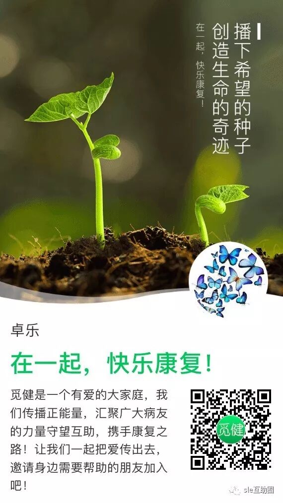 因为圈主是一个“花心”的射手座,可一旦认定就会义无反顾,专心致志,希望以后全国所有的蝴蝶都能围绕卓乐,一起去谱写生命的乐章。我们只做一件事,只对一群人用心,只有一个目标,那就是总有一天系统性红斑狼疮能够完全治愈,让我们卓越快乐!