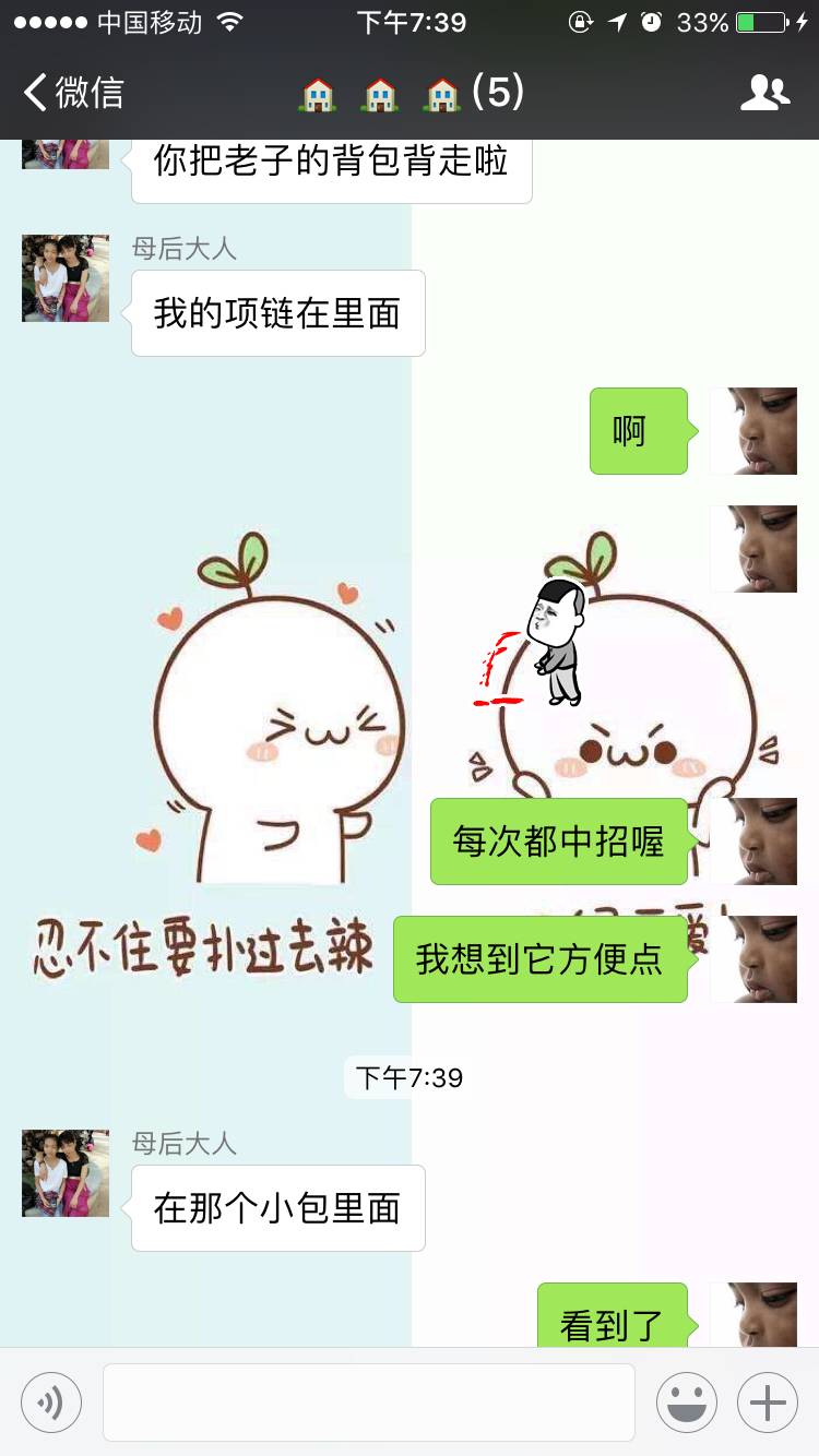 即上次拿了我妈妈放钱的衣服。后天朋友结婚🎎,明早高铁去成都,今天和三哥儿住在县城,感觉麻麻的双肩包方便一点。她又发微信跟我说,她的项链在里面。。。。。吐血中,还好,还在。三哥儿吃了一大碗肥肠粉儿。我吃了一小碗,兔儿面。