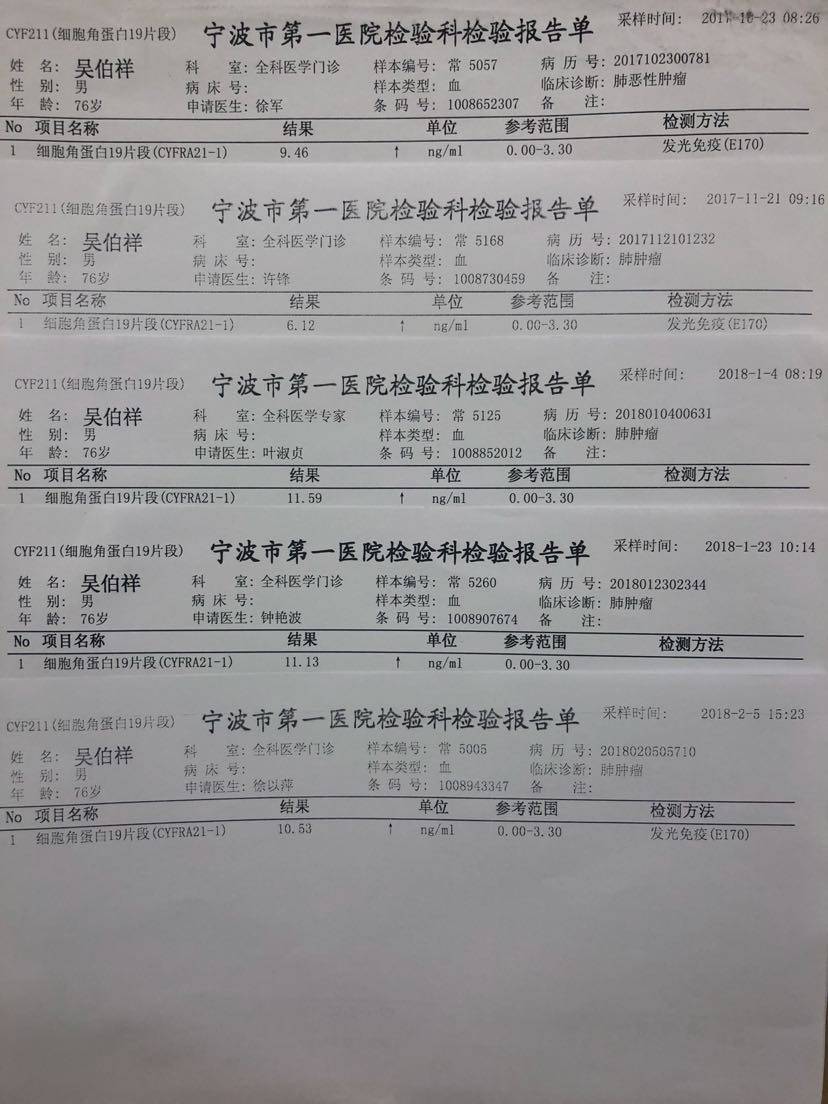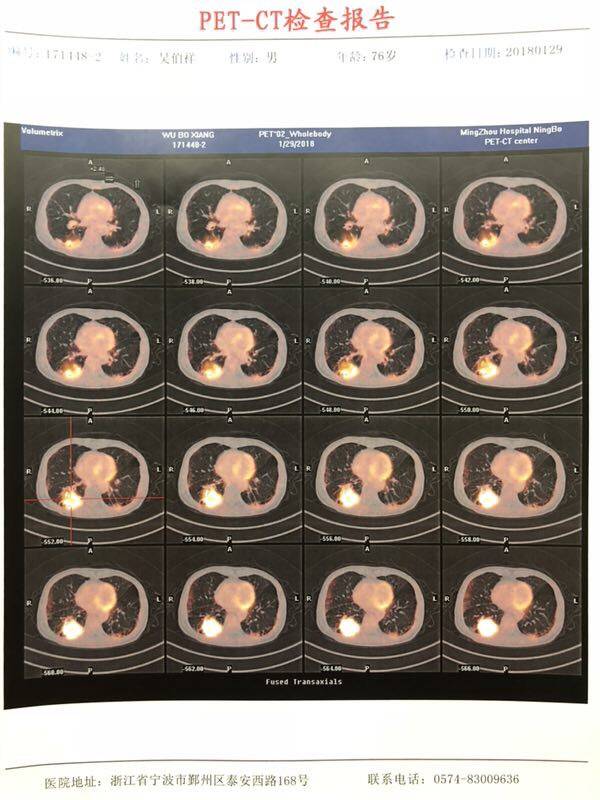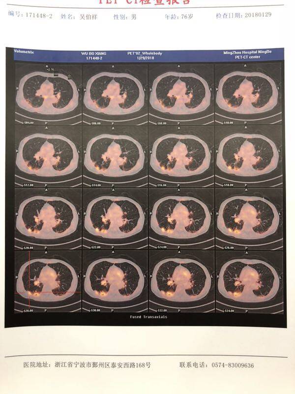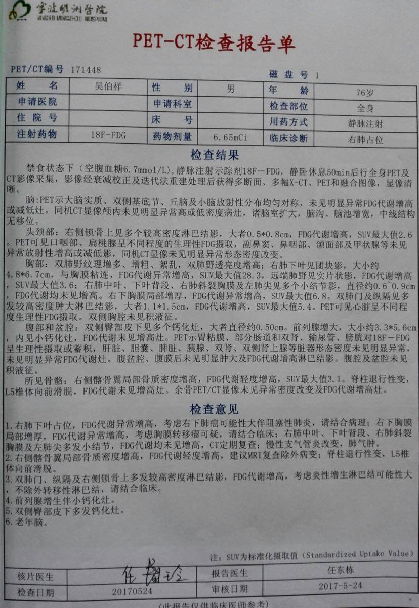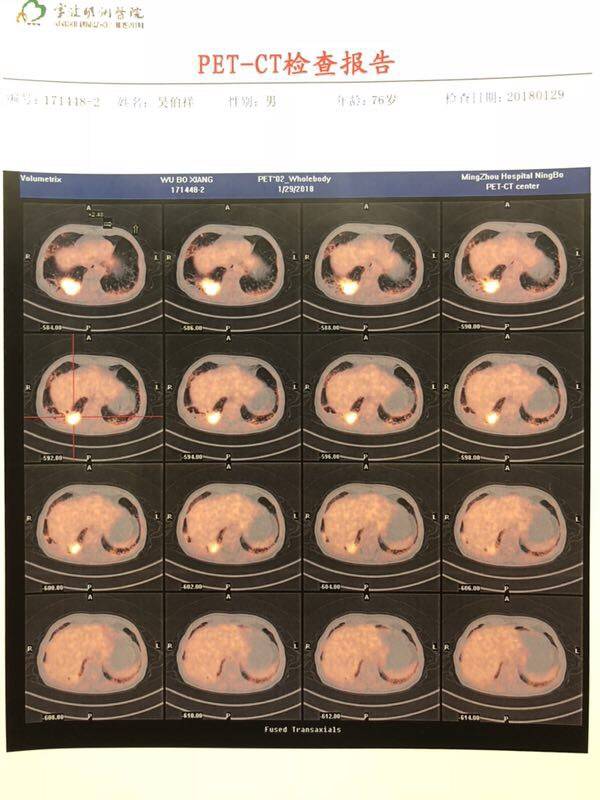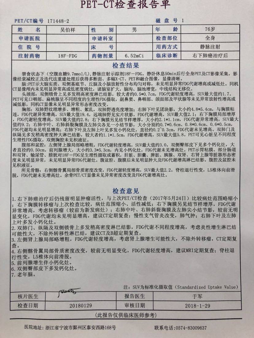 大年三十先给大家拜个早年、祝大家新年快乐、健康平安、幸福永远!因近日忙又累没有及时分享!抱歉!使用九次O后换了I,12号已注入!贴上四张这次PET的影相片子、PET报告单是很厚的一本就不一张张拍上了!再贴上使用O前后两次PET的报告单总结、四次后之八次后的肿标变化和其它检查!以供需要的朋友参考!换药理由:经过进一步检查医生确定O没有耐药、对主灶继续有效、原来粘连侵润胸膜的一片基本脱离、主灶比之前有小、活性也比之前较低很多、医生判断主灶里面白细胞聚多!但在右下胸膜出现新灶(已确定是新肿瘤灶),但O对此新灶无能为力!医生建议四个方案、其中两个是联药、两个是单药、考虑到不管是多温柔的联药方案、副作用都是不可避免的、和医生沟通商仪、决定还是先上温柔的I吧、过年了、平平安安过个年!希望I也给力、接好O的棒!再说下我们九次O的副作用:九次O全程没有什么特别副作用、这点不得不给O赞一个、就是乏力疲劳肌肉酸痛、不过不严重、老爸还经常去钓鱼!效果:四次时评估效果棒肿瘤比使用前小一半、肿标也下来一大半!八次评估时比四次时进展0.5,肿标也上去了!刚开始考虑是耐药了、故又做了PET、医生经过PET判断、没有耐药、但需要处理新灶的特异性、所以只能换方案!还有敏感肿标其实是非常有参考价值意义的、我们四次后效果那么好、至使我得意忘形飘飘然、松懈了下来、以至于在四次评估后至八次评估之间只做了一次肿标、那次肿标211还是继续下来的、但SCC上了0.1,自从使用PDI后我们这两肿标一直往下走的、那次SCC没有下来当时我心里有过嘎瘩、但当时我人还在上面飘着、被我疏忽了没有引起我太大注意、结果八次评估时进展、两肿标全部往上走了、其实那次SCC涨了0.1已经是在提醒我了、但飘着呢无法着落(我们211、SCC就这两种标特别敏感,我们的CEA很幽默、使用PDI前一直正常范围、使用第一次后就往上串了超出正常范围、后来又慢慢下来了),然后八次后我又做了两次肿标、两次都是又往下走了!O的威力还在继续、O给了我们五个月的高质量生存期、还是很感恩!舍不得离开、但又无奈!另外这两次C反应一直往上串、体感和原来一样没有变化、医生判断是新灶做怪、先观察!I药已打进去三天了、第二天怕冷畏寒、不过昨天已经好转、怕冷可能是它的副作用吧!往后我还继续一如既往的分享我们的免疫治疗经历、希望能帮到需要的患友!期望I给力🙏再接再厉怒超O