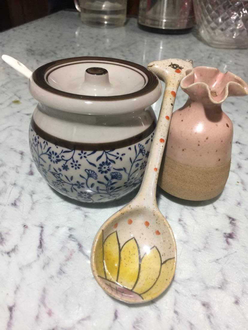 他给我买的东西。一个盐罐,勺子,花瓶,还有个招财猫。