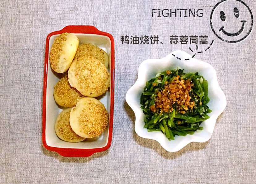 昨天在奶奶家过完年回家,拿回来好吃的需要冷冻,就得需要冰箱腾地儿了。冷冻室里有剔下来的鸭皮和焯过的茼蒿,鸭皮熬了94克的鸭油,按照蛋黄酥的做法做成烧饼,茼蒿就蒜蓉。烧饼的油皮是150g高粉,47g鸭油,73g水,2g盐,1/2小勺酵母,放面包机和面,和好静置30分钟,油酥是100g低粉,47g鸭油,花椒粉和盐适量,和匀放冷藏,按照蛋黄酥两次擀卷,最后涮蜂蜜水,粘芝麻,烤箱预热177烤38分钟,个人感觉油皮的油多了,成品太酥,没办法切断面了;