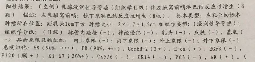 我手术后第二天医生过来说,结果都还好,腋窝保住了,前哨淋巴结取了5枚活检,都没转移。然后住院了一周等病理报告出来,医生和我说还有一个指标2➕,不上不下,不三不四,如果阳性就钱贵,如果阴性就没那么贵,但不是很大的影响。但是要重新做个fish检测,最后检测出来是阴性的。我对乳腺癌具体分型完全不懂。有懂的姐妹吗?帮我看看,我的这个属于哪个呢?组织学II期是中期乳腺癌吗?谢谢