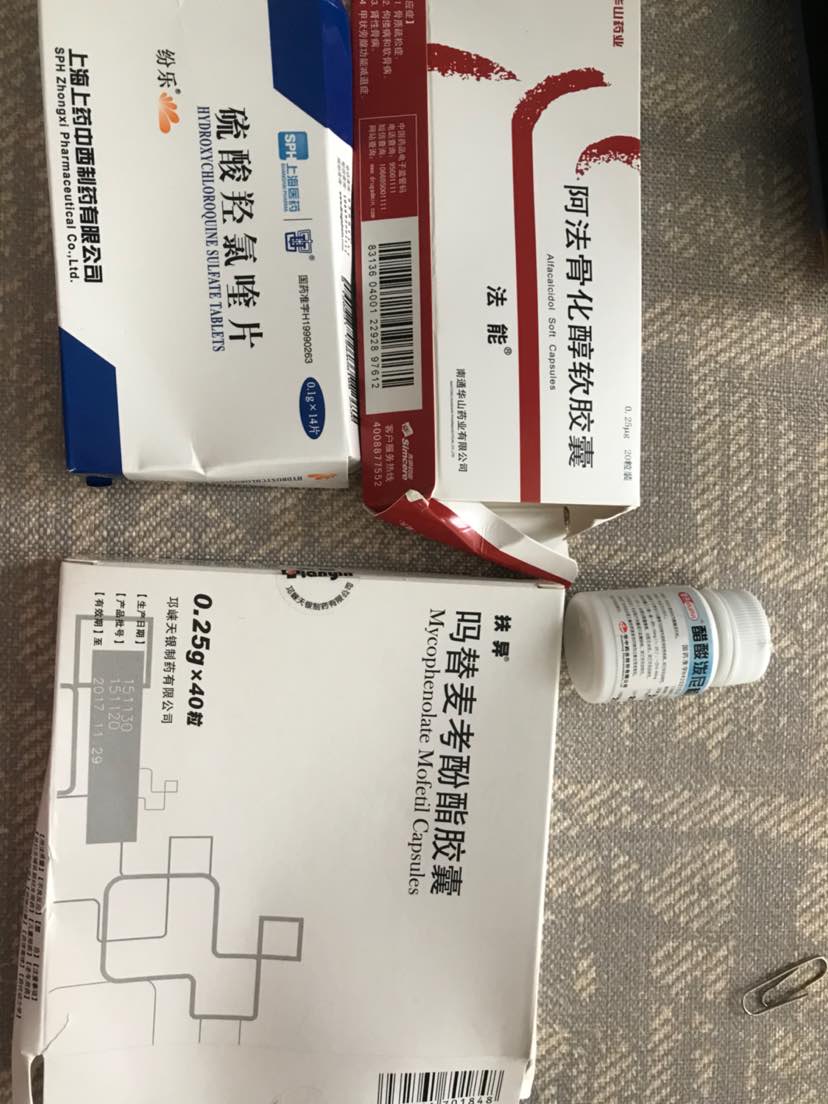 我在郑大一附院看的,我都八九年了,现在吃的纷乐,百灵胶囊,复方丹参片,代文,阿法骨,赛可平,更昔洛韦胶囊,他克莫司胶囊,钙片,强尼松,狼疮9年,狼疮肾四年