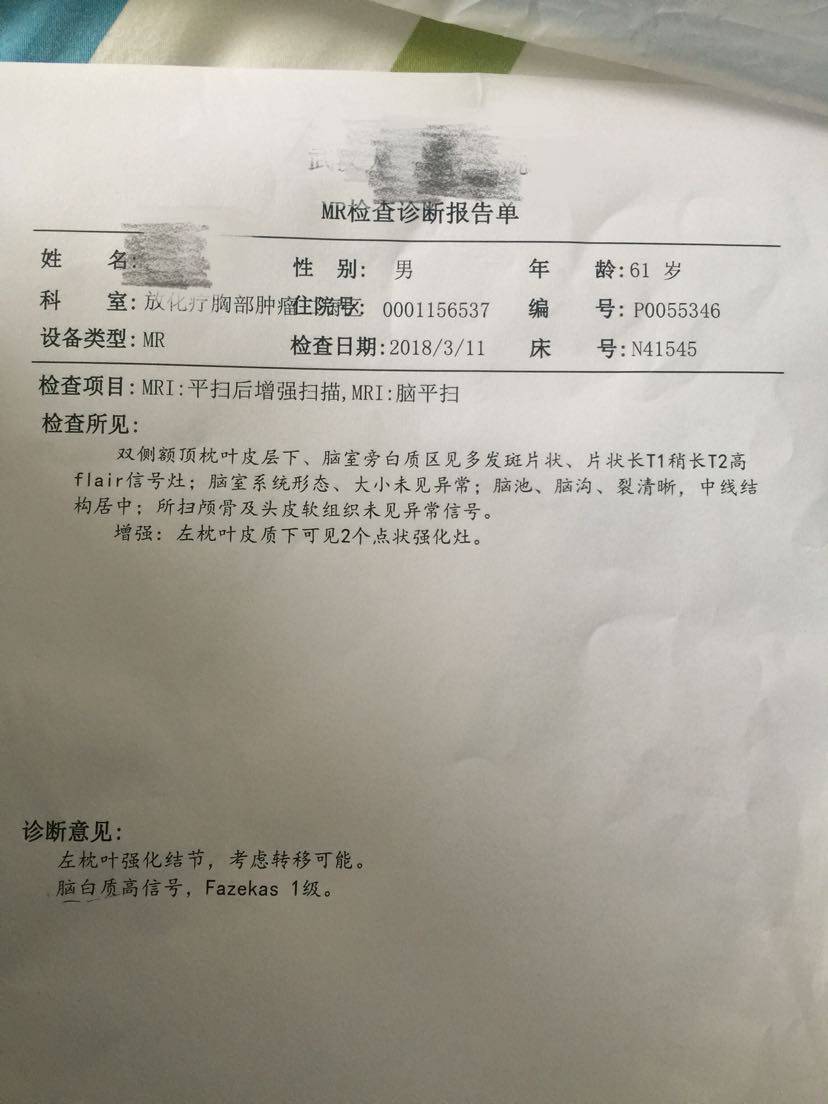 肺鳞癌术后半年怀疑脑转移,哭过之后擦干眼泪继续战斗。求教觅友们,脑部放疗采用哪种方式好?射波刀、伽玛刀、还有立体定向放疗,哪种更好?目前我爸没有脑转症状,一个结节4mm、一个结节2mm,医生建议观察一个月,如果增大就放疗;如果没有变化就继续观察。另外,无基因突变盲试靶向药是选择特罗凯还是9291?我知道阿法替尼是指南规定的鳞癌用药,但阿法替尼入脑效果不好,没用。我家pd-L1表达65%,目前由于放射性肺炎的存在暂时不考虑上pd1。此次脑部放疗后如何预防下一次的脑部复发呢?毕竟放疗治标不治本。另外,求有经验的觅友帮忙看一下脑部核磁影像,看一下鼠标指出的地方是否确为转移瘤。叩谢各位觅友了。