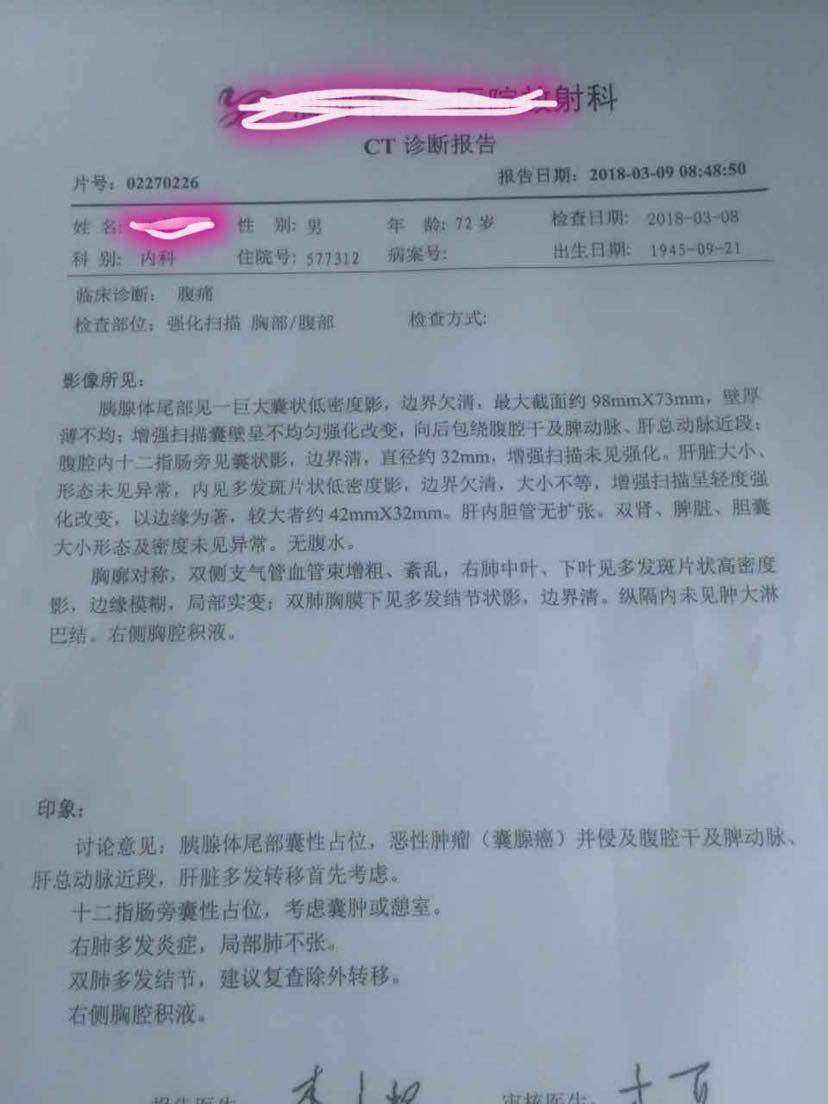 家中有老人今年72岁,腹痛2-3月,期间食欲也越来越差,偶尔便秘,消瘦乏力接近20斤,一直以为是胃病,结果胃镜什么的都做了没什么大问题,打针吃药效果不明显,后来有两天腹疼很厉害,就准备去市级医院详细检查,医院建议做强化CT确诊,结果给出让人无法接受的结果:胰腺尾囊腺癌。