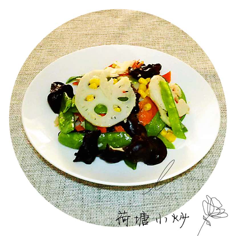 荷塘小炒:木耳泡发去蒂备用,荷兰豆去筋洗净备用,胡萝卜和藕切片备用,玉米粒是罐头的,用水冲洗后备用,蒜切末备用;取一水锅,放盐和油,胡萝卜和藕片烧开,水开后放荷兰豆和木耳和玉米粒,20秒后捞出沥干水份备用;起一油锅,放蒜末炒香,下焯好的菜,放盐调味,出锅钱放鸡精拌匀即可。