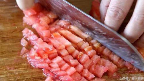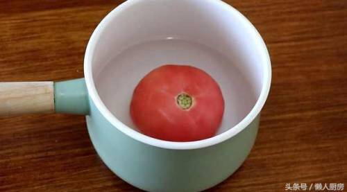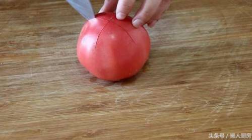 番茄打上十字花刀,放入热水中汆烫一下,烫到西红柿皮飞起来就好。