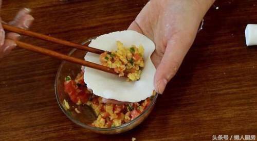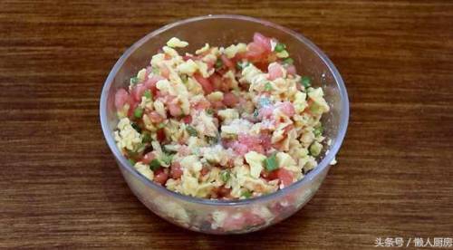鸡蛋末儿、西红柿丁、葱末放一个碗内,加盐搅拌均匀,做成馅儿备用。