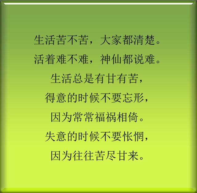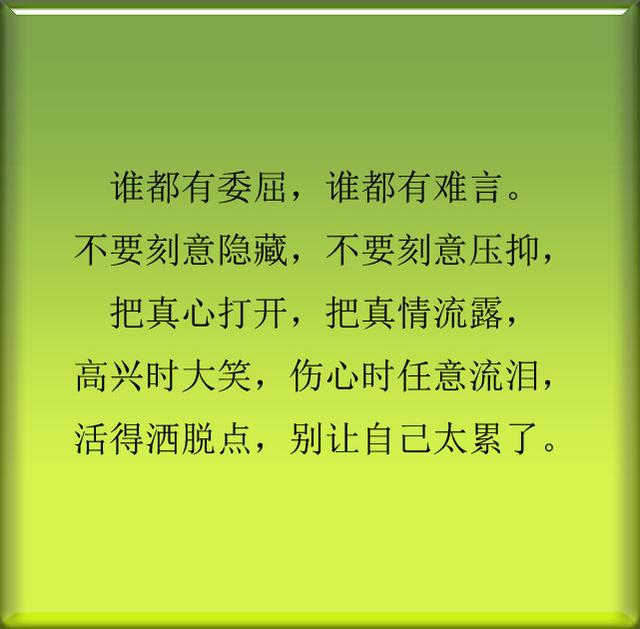 人生最难走的路是心路,最难解的锁是心锁,最难开的门是心门,最难过的砍是心坎,最难医的病是心病!人生最难改变的是习惯,最难把握的是机遇!人生最难实现的是理想,最难战胜的是自己!人生最难说出的是真话,最难保持的是健康,人生最难的是,控制自己,控制自己不为金钱所惑,不争不气,不人云亦云!人生最难的是,坚持到底,坚持做自己喜欢的事情,不仅是自己有所收获,也是别人眼中最美的风景!