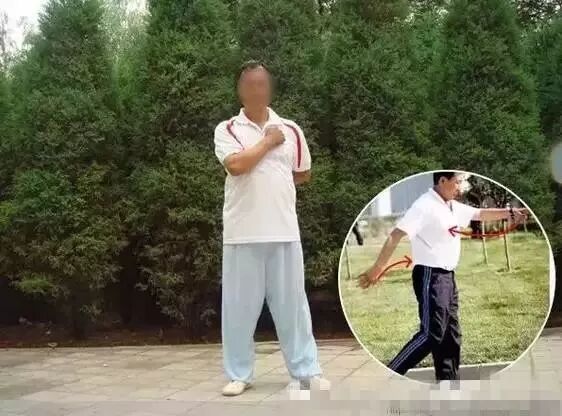 ③然后迈右腿,左手拍打右胸,右手拍打左后腰,一边前进,一边拍打。