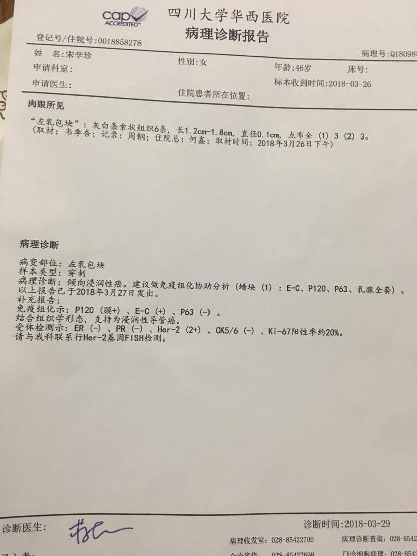 三阴性乳腺癌,估计后期要放化疗了,跟着主治医师意见走吧,祝你妈妈早日康复