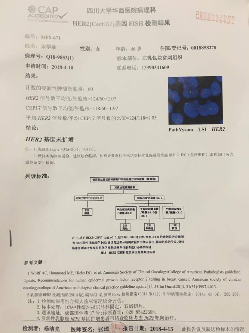 要做f!Sh检测是阴还是阳,如果是阴,病理就是三阴,如果是阳,就是二阴一阳,需打靶向