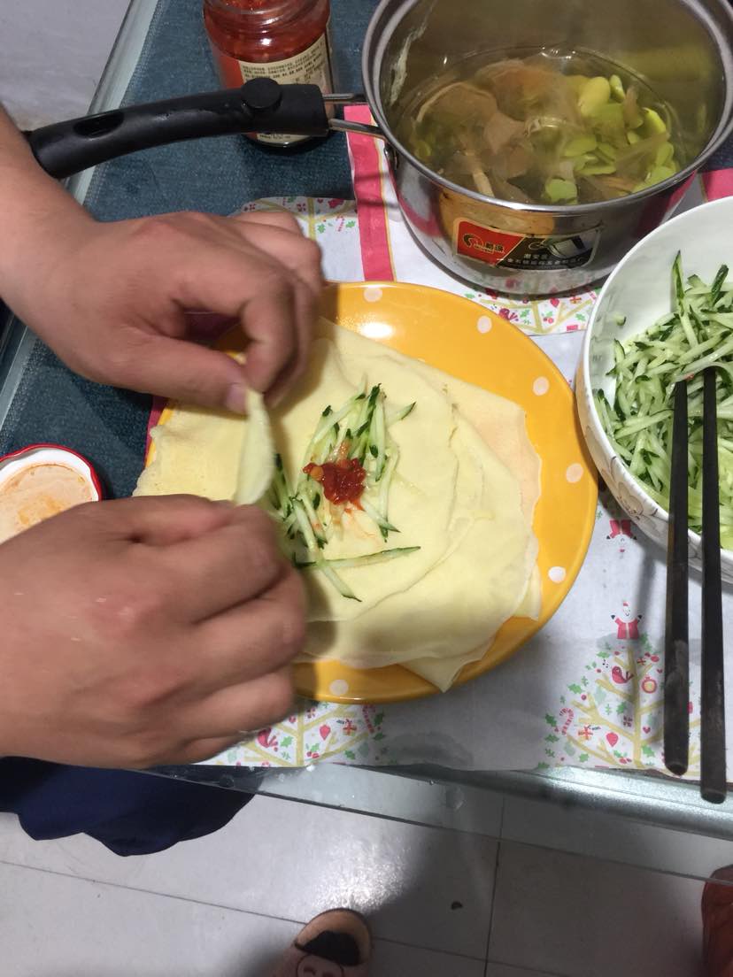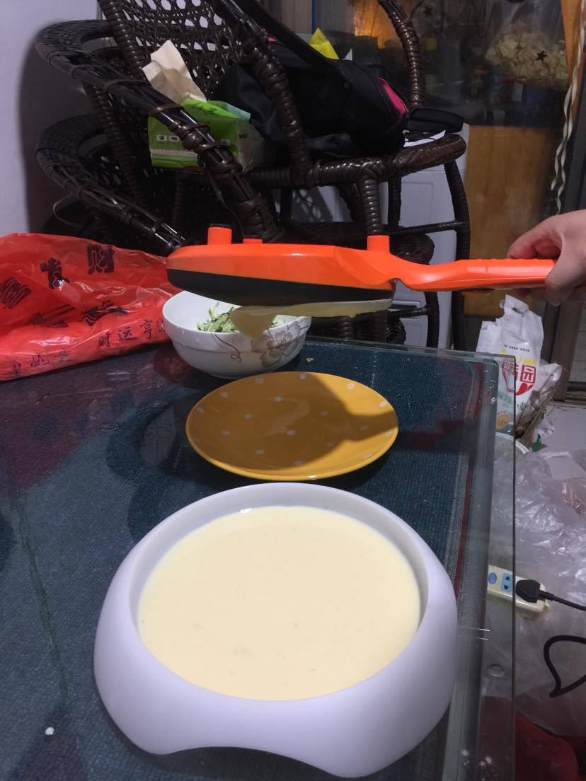 把神器拿出来,给他做了鸡蛋饼。剥了蚕豆做了个汤。。他嘻皮笑脸的,说很好吃。。