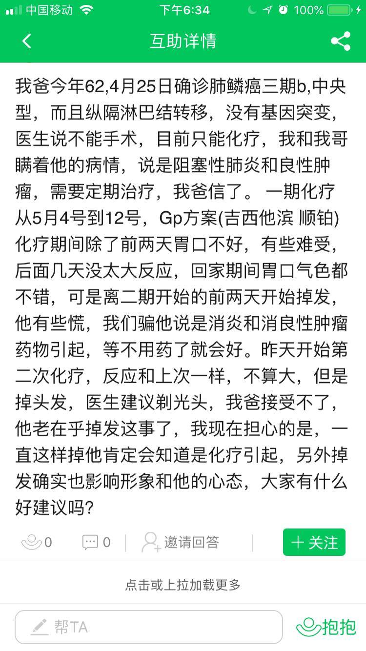 我爸其他状态都好,二次化疗前做了各项检查,指标都正常,掉头发这事让他很恼火