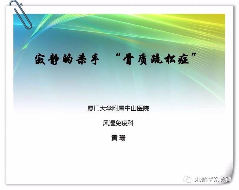 三月的一天,大掌柜和阿旋在聊天,她兴奋地告诉我:“五月份要去厦门大学附属中山医院帮着风湿免疫科的黄珊主任给病友分享预防骨质疏松的内容”。当时大掌柜非常的疑惑,搞不懂啊,明明是一位系统性红斑狼疮患者,为什么要做骨质疏松的预防呢?