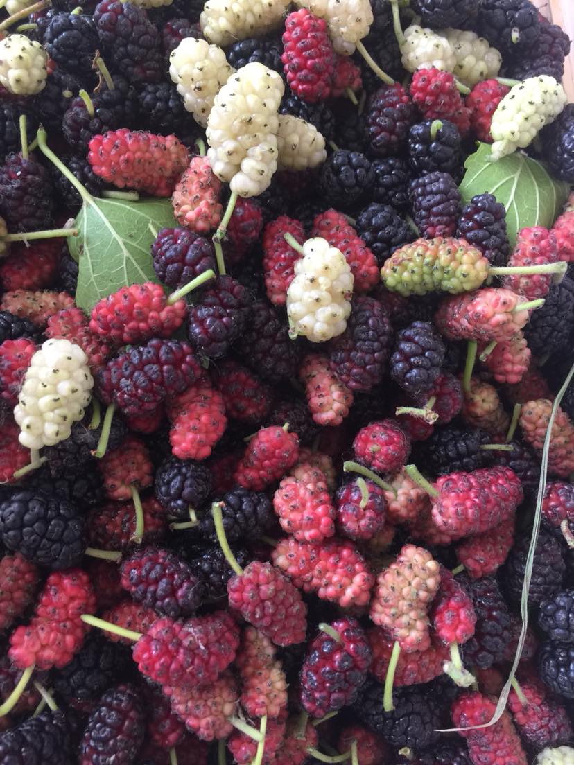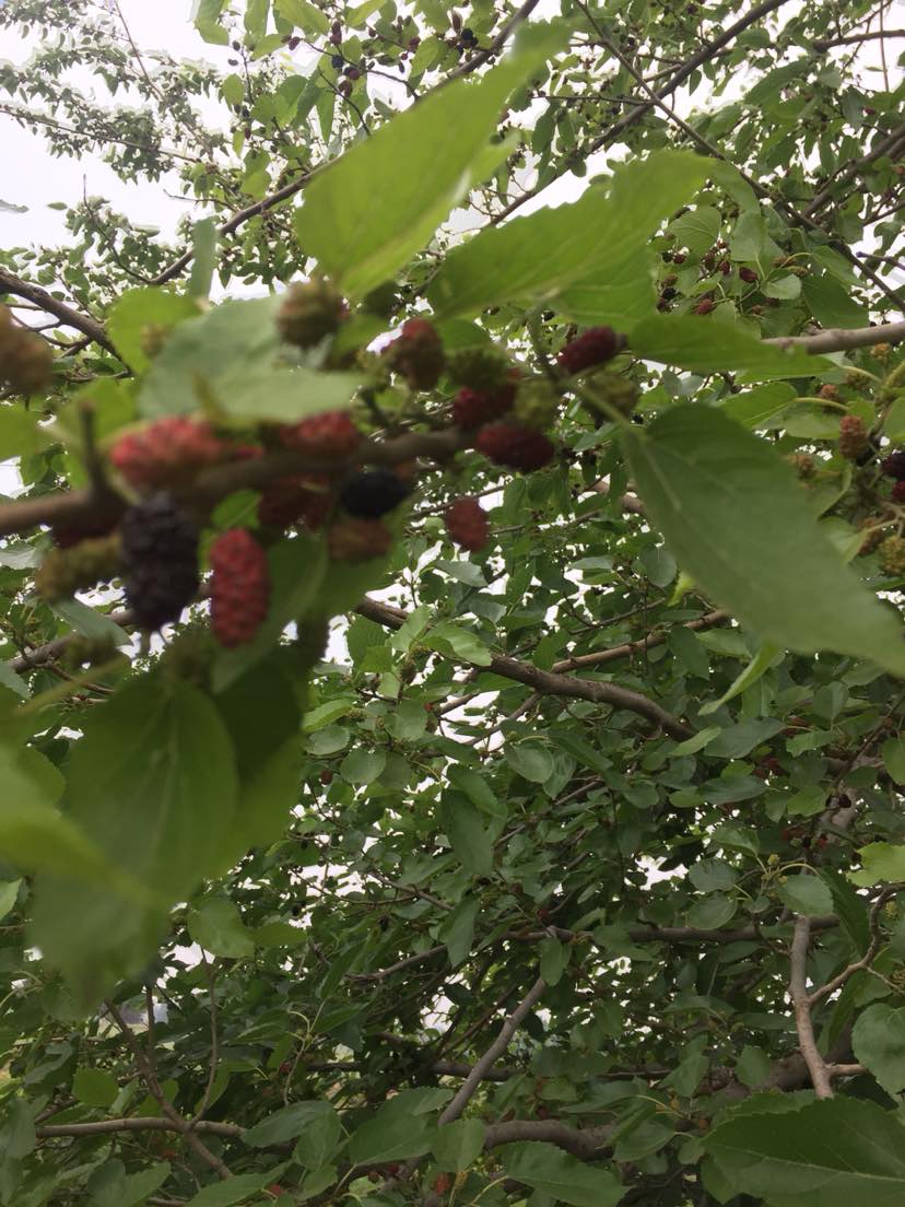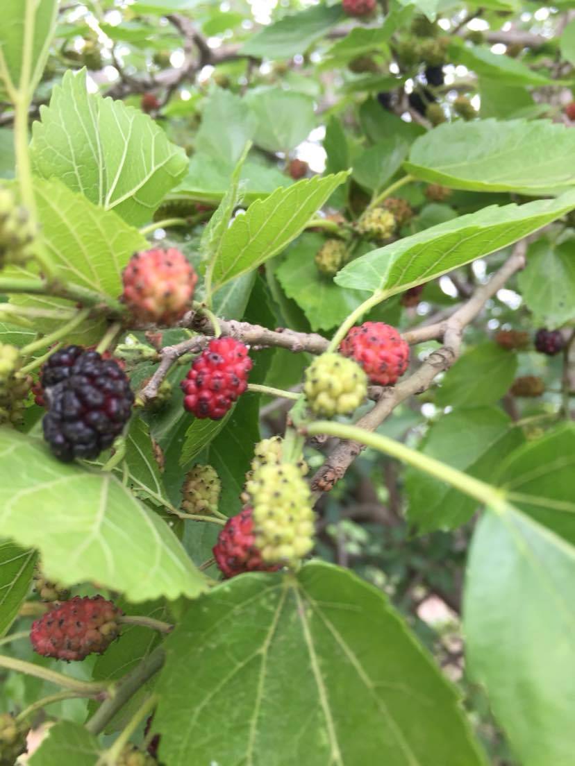 今天和表妹一起去摘了一筐野生的桑葚,小小的果实挂满了枝头,红的,紫的绿的,还有白色的,紫色的最甜了,红色的酸酸的,绿色的是还没有熟,白色的是另一个品种,没熟的时候是白绿色,熟透了就变得白白的了,吃到嘴里特别甜。