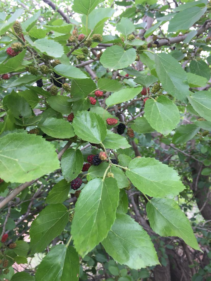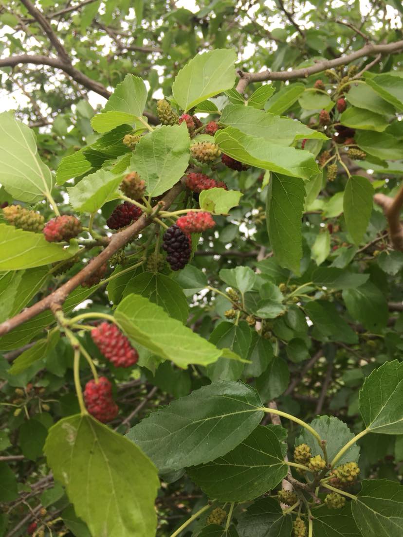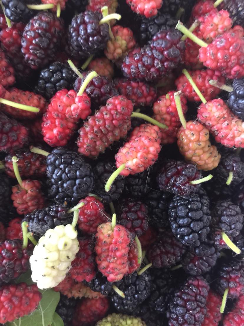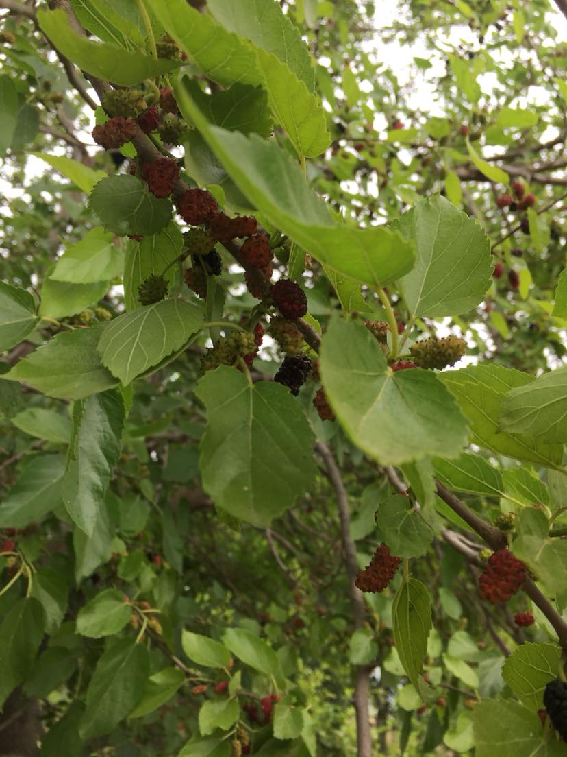 今天和表妹一起去摘了一筐野生的桑葚,小小的果实挂满了枝头,红的,紫的绿的,还有白色的,紫色的最甜了,红色的酸酸的,绿色的是还没有熟,白色的是另一个品种,没熟的时候是白绿色,熟透了就变得白白的了,吃到嘴里特别甜。