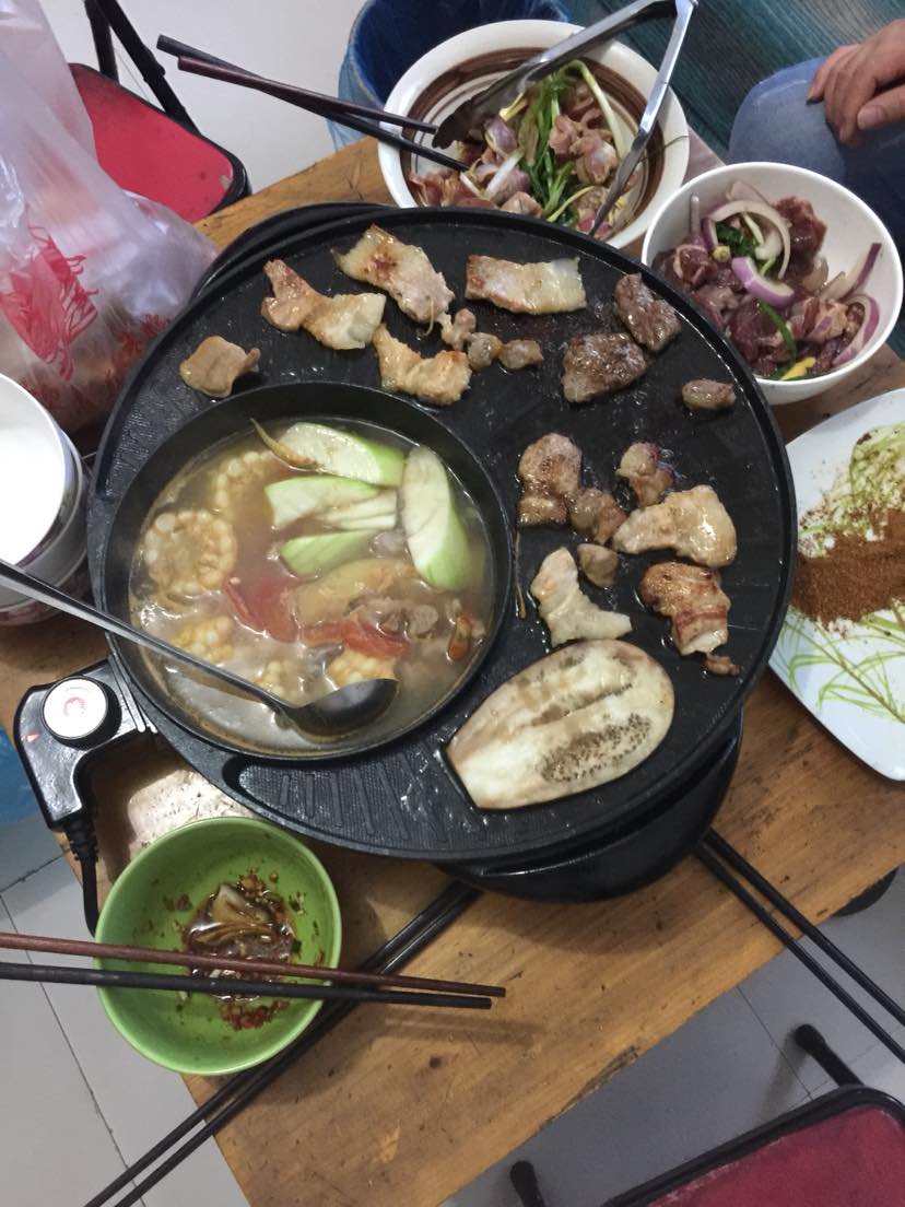 烤猪肉牛肉,各种菇,螺丝,各种瓜。。吃得撑死。。