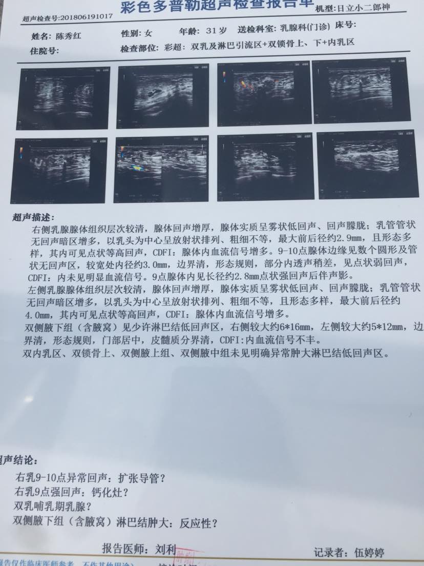 本人31岁,双乳增生伴导管扩张多年了。现哺乳期8个月今彩超检查结果如下,医生说喂奶期间暂时不管。但我十分担心不知到该怎么办了,我本想给娃把奶段了,但医生说可以继续喂奶。