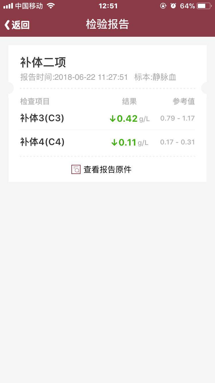 没看到尿蛋白的结果?补体下降了也不是好现象,我这次也是补体有点降医生没给减药,所以多注意,别熬夜了,饮食也别太咸太辣,