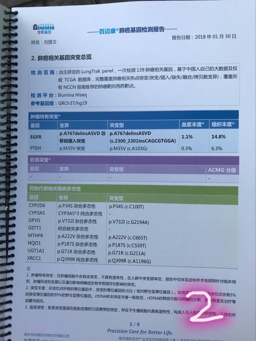 爸爸于17年12月21日胸部ct查出来肺癌晚期,右中肺伴两肺转移,纵隔淋巴转移,一周后病理确诊肺腺癌四期。在医院做个三个点的基因检测全部野生型,选择一线放疗评估无效。我不死心重做基因检测如下图1,无药可用。继续第二个疗程化疗无效,直至18年3月份又经人介绍做了第三次基因检测结果如下图2,用药后第一个月病灶控制的很好,第二个月开始进展了。于是又做第四次检测如下图,用药一周完全无效反而加重病情!现在被要求做第五次基因检测!我到底该怎么办?求大神帮我看看帮帮我,下面分别表示每次的基因检测结果及用药。跪谢!家里唯一的女儿,爸爸的命就掌握在我的手上!只求提高后期生活质量🙏延长点生命!