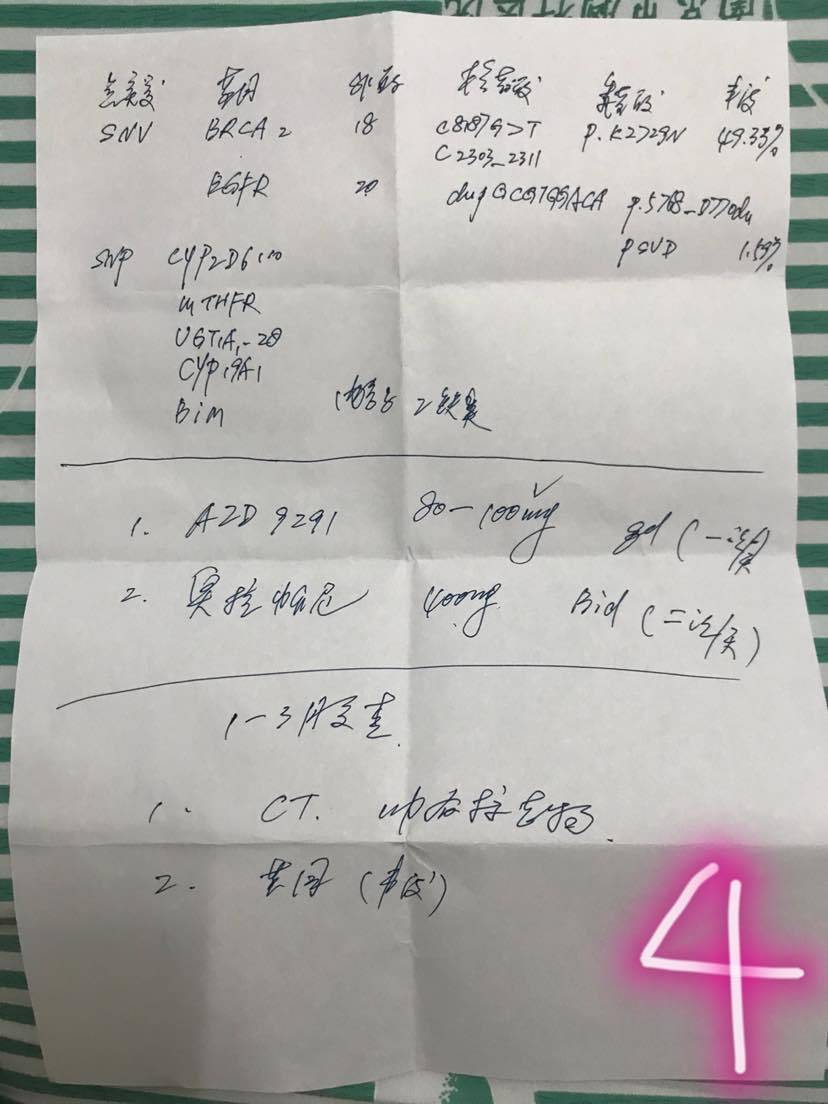 1、没有看到图一 2、图二的报告是1月份的 但是你说是3月份做的检查。3、用药一个月有效 用的是什么药呢?4、第四次的基因检测 没有正式的报告么?为什么是手写的啊?这一次又用的什么药啊?5、之前做的基因检测是用血液做的么?血液相比组织 准确率会低一点。一共检测了多少个基因?如果想找到靶向药 光测几个三两个基因是不够的。想找到引起耐药的基因,那就需要检测更多的基因。6、现在病人身体状况如何?你们有没有考虑过抗血管生成的药?肿瘤生长需要生产血管来获取养分,可通过抑制血管生成来抑制肿瘤生长。但这类药副作用也挺大,特别是对年纪大的人。用药时间不能太长,救急或短时间服用。7、如果病人身体状况比较好,或许可以考虑免疫疗法,如pd1。8、还有一些老药新用的药,如阿发他汀、二甲双胍、多西环素、甲苯达唑。英国一家癌症机构推荐四种广谱癌症药物。大大延长患者生命。这已经是不止一次报道。感兴趣的话,你可以去查查看。