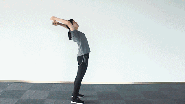 练习时需站立,肩松,两手臂下垂伸直于体侧,双手臂前伸上抬,甩至头顶上方,同时配合挺胸仰头,再将双臂返回前甩至下后方,同时配合伸腰低头活动,如此连续甩手7~14次。
