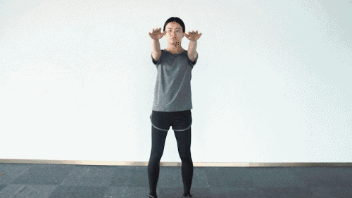 1、双脚与肩同宽,平行站立,呼吸自然。双手举至胸前,与地面平行,掌心朝下。