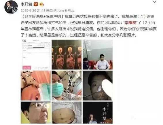 然而,在2015年6月30日,李开复发微博称,“最近两次检查都看不到肿瘤了”,自己已经完全康复,肿瘤消失。