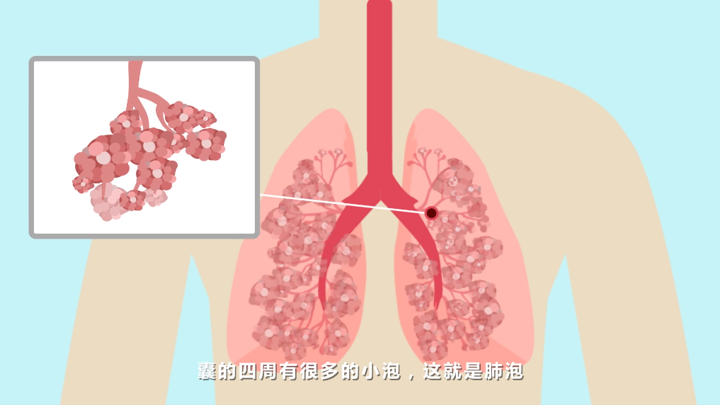 肺的支气管经过多次反复分枝,形成无数的细支气管,这些很细小的支气管的末端膨大成囊,囊的四周有很多的小泡,这就是肺泡。成人肺泡的总面积,全部展开相当于一个网球场的大小。
