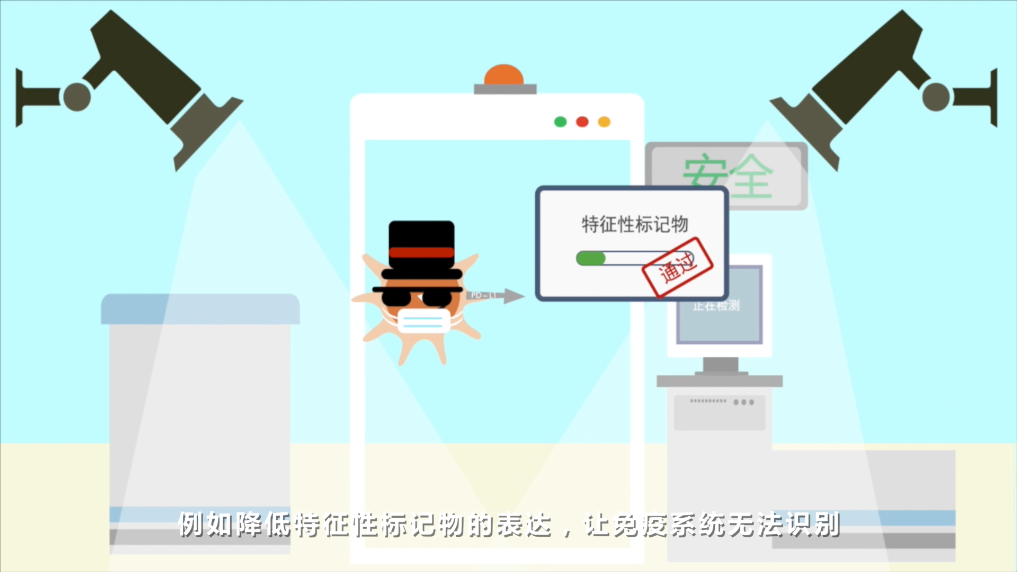 例如降低特征性标记物的表达,让免疫系统无法识别。