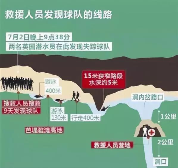 7月2日(进入溶洞的第十天,救援第九天)晚上9点38分,两名英国专业潜水员在距溶洞入口4公里处,终于发现了这群孩子。