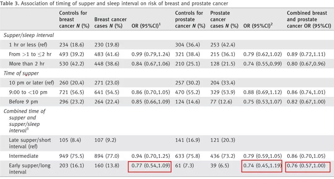 与在晚上10点后吃晚餐,晚餐-睡觉间隔时间≤2小时的个体相比,晚上9点前吃晚餐且晚餐-睡觉间隔>2小时的个体患癌症的总风险减少将近25%(总OR 0.76)。并且这种风险的减少在前列腺癌和乳腺癌中都可见。