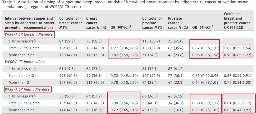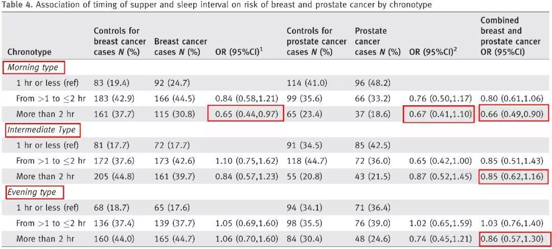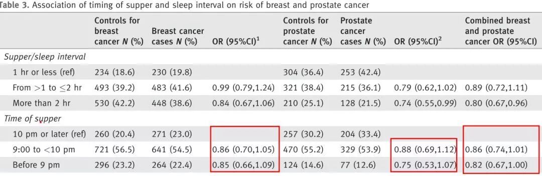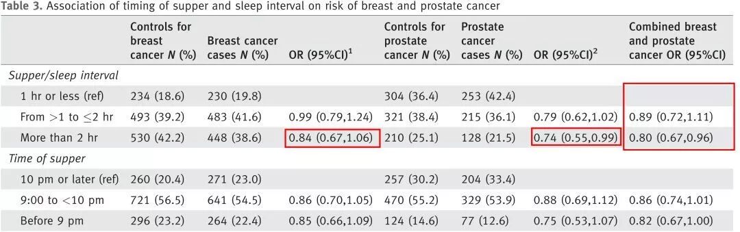 1. 与晚餐-睡觉间隔短的受试者相比,晚餐后两小时之后睡觉的受试者患乳腺癌和前列腺癌的风险总比下降20%(调整后OR 0.80, 95%CI 0.67-0.96),其中前列腺癌(OR 0.74,  0.55-0.99), 乳腺癌(OR 0.84, 0.67-1.06)。