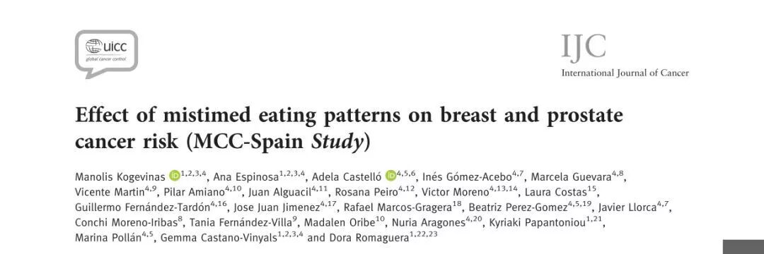 [1] Kogevinas M, Espinosa A, Castello A, et al. Effect of mistimed eating patterns on breast and prostate cancer risk (MCC-Spain  Study)[J]. Int J Cancer, 2018.