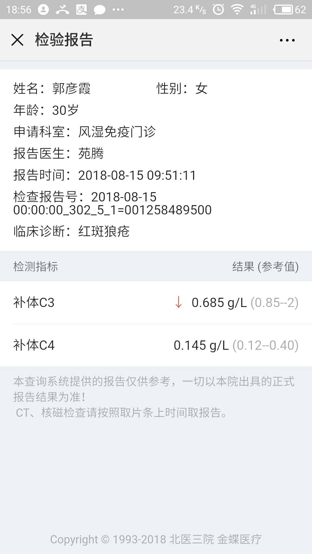 补体的结果,虽然还是低但是比上次6月份老家查的升高了