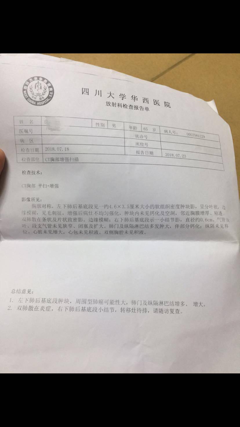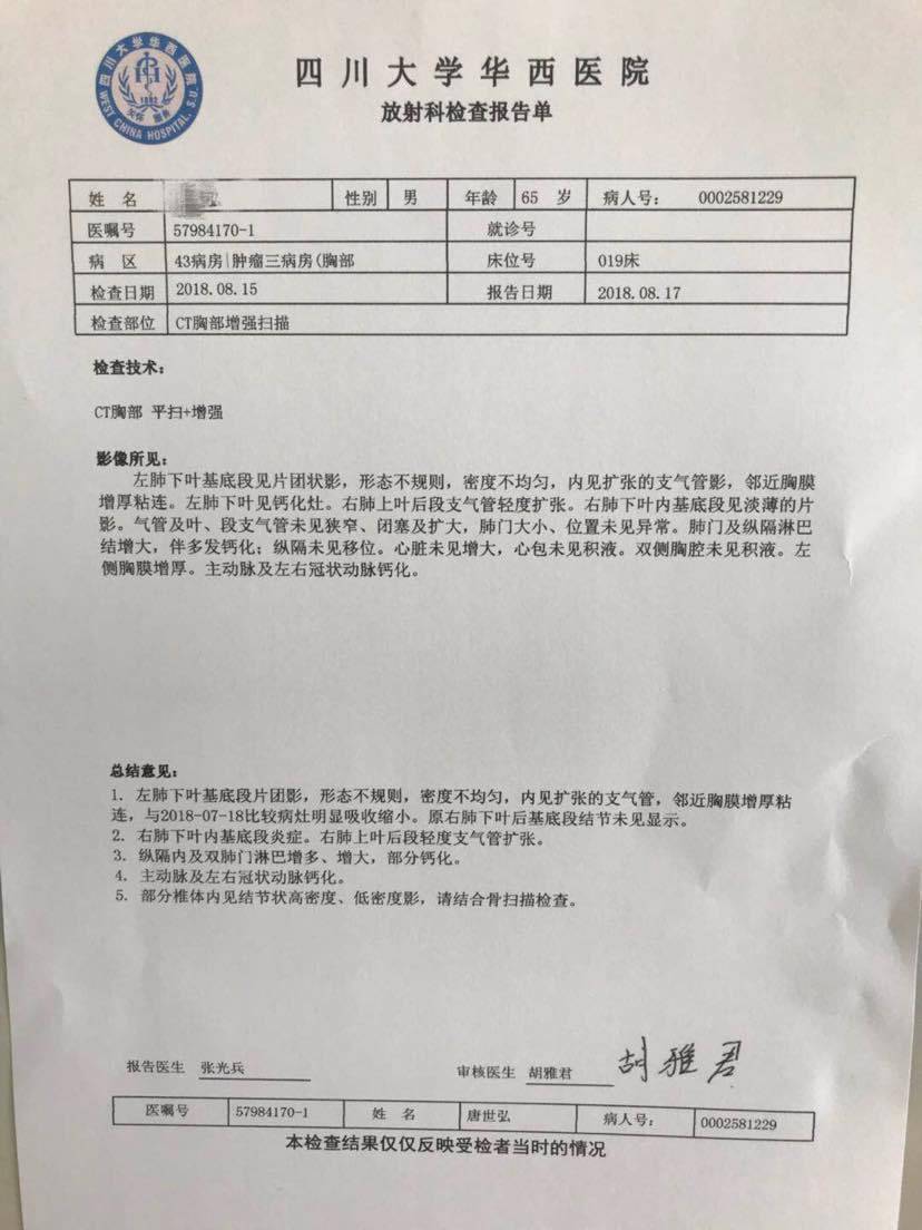 你好,我也是四川的,请问一下你是怎么入组的,我和你父亲病一模一样的,我的检查也是在华西做的,检查完就回当地化疗了,你们是属于初诊者没做过任何治疗才可以入组的吗?我在刚确诊的时候看到华西在做这种招募,