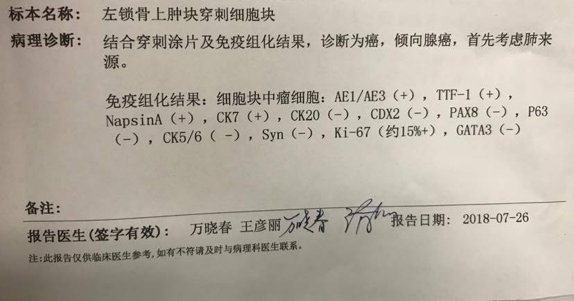 与此同时又在2018.8做了左上锁骨组织免疫组化和基因检测,显示特罗凯耐药,并同时存在PIK3CA基因突变,医生说目前无药,只能试试安罗替尼。