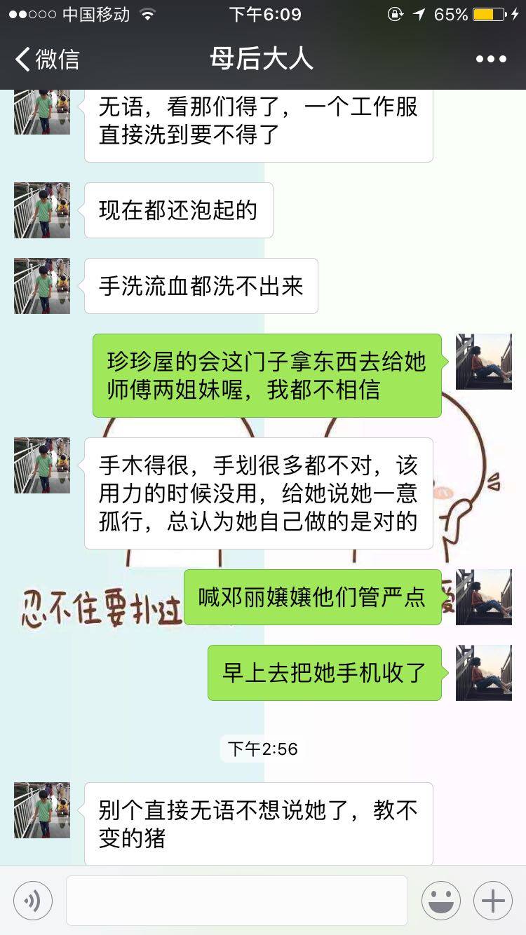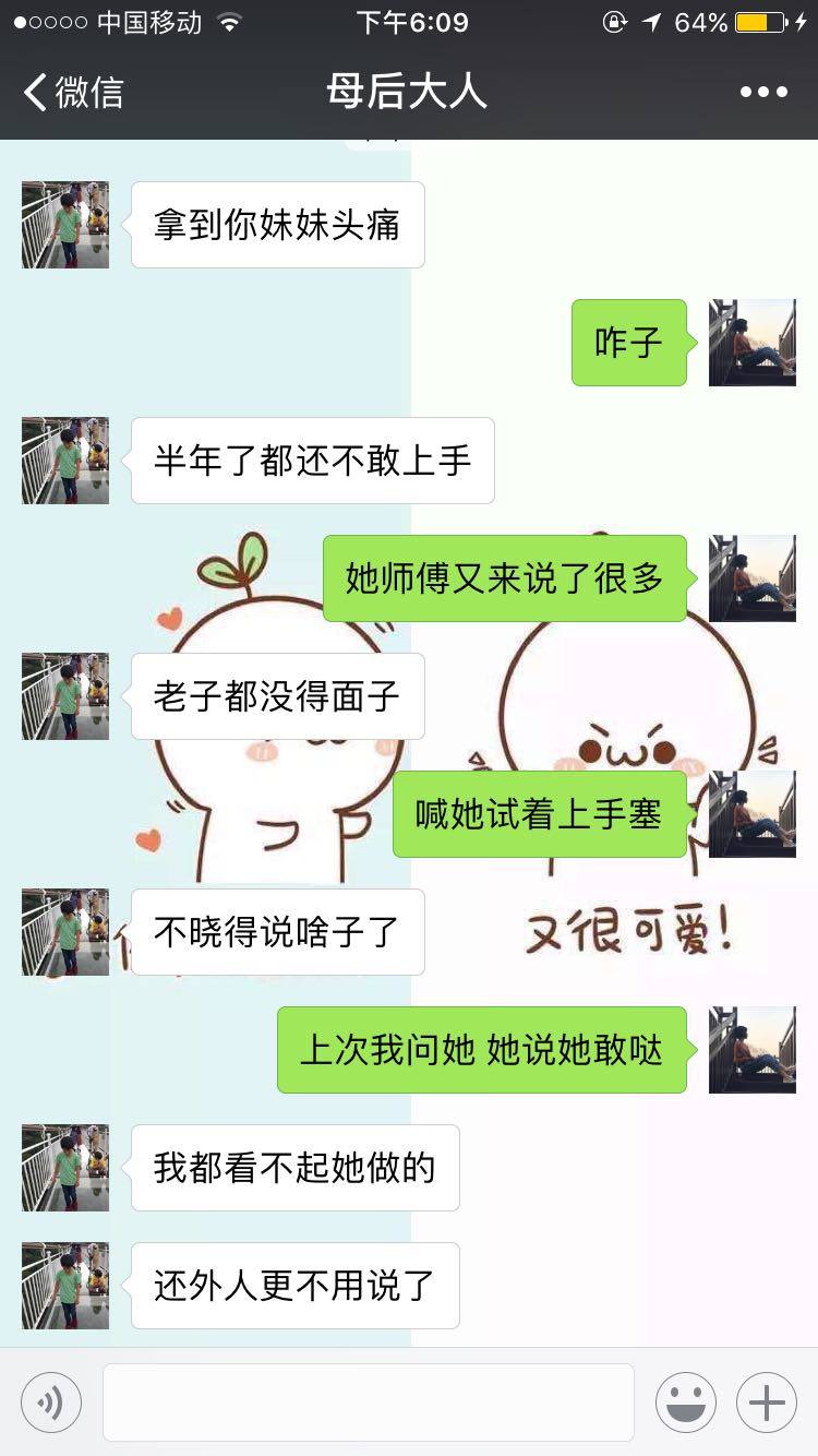 虽然是我妈的朋友。但是我妈也是各种送礼,陪笑。自从二姐儿去了那里,我们家三天两头的在送礼。她店里的产品也是 推荐也只能买。我妈让我说一下二姐儿,结果人家压根儿不回我微信。每次都是我妈去让她练手,也照着美容院洗脸的价格收,一次几十。不听话真的无奈。我那个时候上班 感觉自己都会认真学习,生怕自己比别人差,她倒好 吃喝玩 耍手机。我们家还真没她这样性格的 不思进取。在我面前真的要揍她。生气。