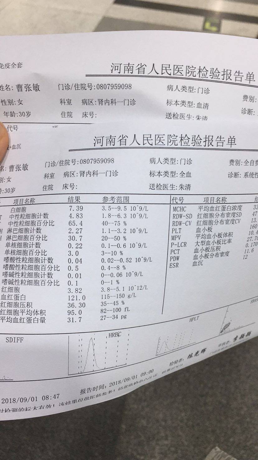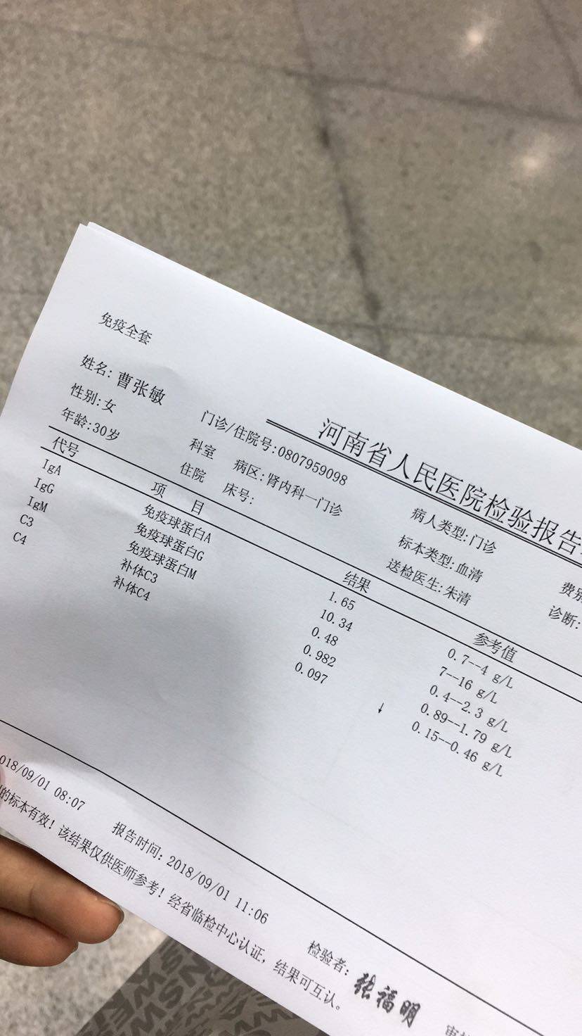 第一次复查,血常规正常,肝肾功能正常,补体有点低,等周一找大夫看结果,等大夫定减药方案,心情忐忑