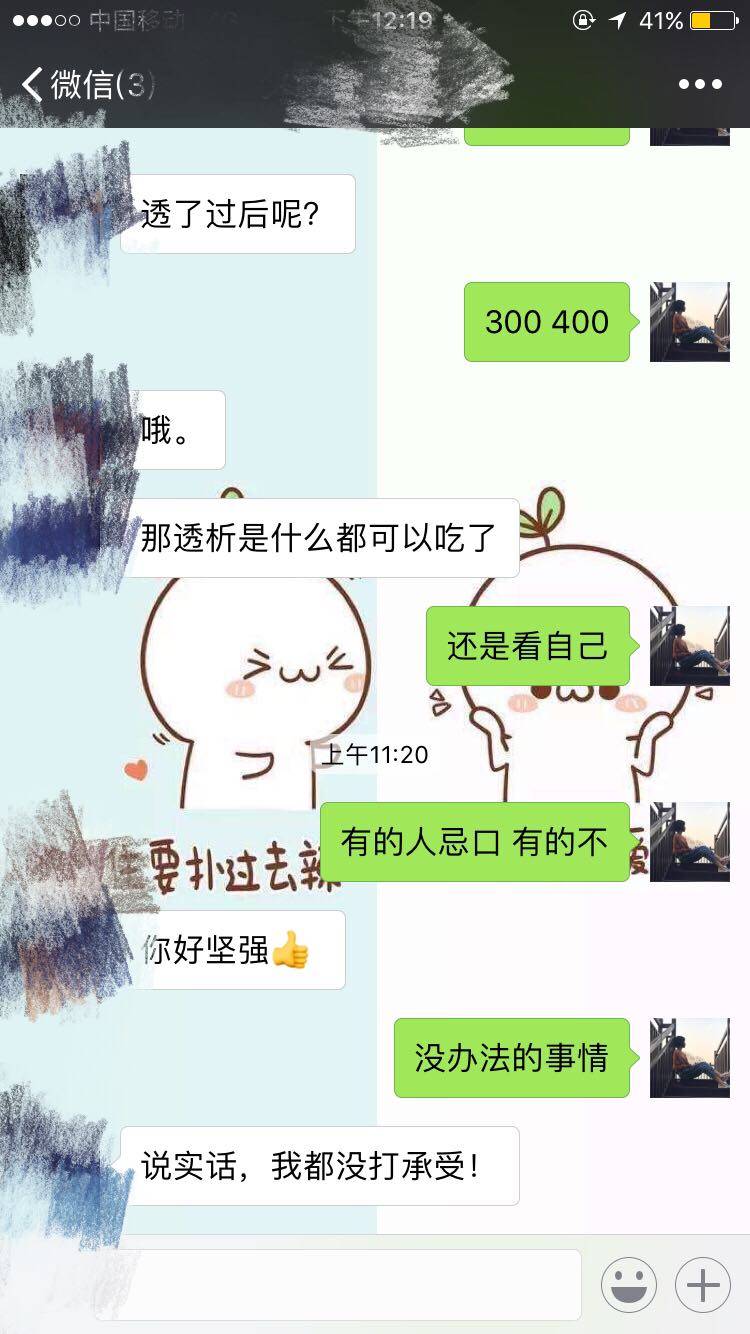 昨晚我的丑侄女闹了一晚上我也没睡好。准备透析了。明天又去开药了,他克和赛可平。其实最开心是病友说谢谢,也帮她们省了钱 (此处有马赛克。)星期三做血滤,星期五做血灌(平时是血透 透得没那么干净 这两种都透得比较干净 感觉可以多吃点乱七八糟的东西,好吧我有点飘了)今天又有一个狼疮快透析的病友加我。我也只能安慰她,真正走出来还是要靠自己。不管怎样,我们都会越来越好✌🏻
