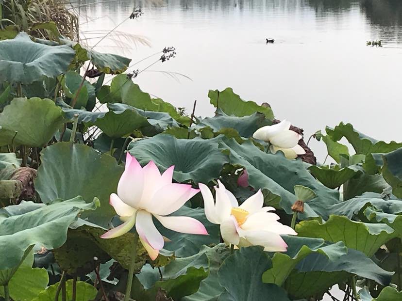 早上晨练,顺便拍拍漂亮的风景,公园的荷花都凋谢了,只剩少数一些还开着,荷叶很多也黄了,但叶下的野鸭还是挺悠闲的!