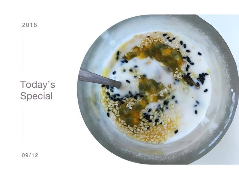 佐料丰富,加了葡萄干、百香果、黑白芝麻,这样的口感,没有加蜂蜜也蛮好吃,之前一直对不能加蜂蜜耿耿于怀,激素受体阳性不能吃蜂蜜,还不能喝全脂牛奶,真心没办法。方法总比问题多,多鼓捣几次,总会有最好的口感出来。比如今天的酸奶,脱脂的,还是全天然的果香甜味,既补充了优质蛋白,有尝到丝丝甘甜,100分!