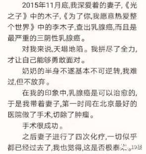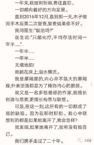 (擅长写作的人,天生敏感而多思。在他爱人得病期间,免不了患得患失,家里的气氛压抑、愁云惨淡,可能这些都对病人的心理健康不利。咱们姐妹们更要吸取教训,努力营造乐观积极的心情态度,使悲剧不要重演!)