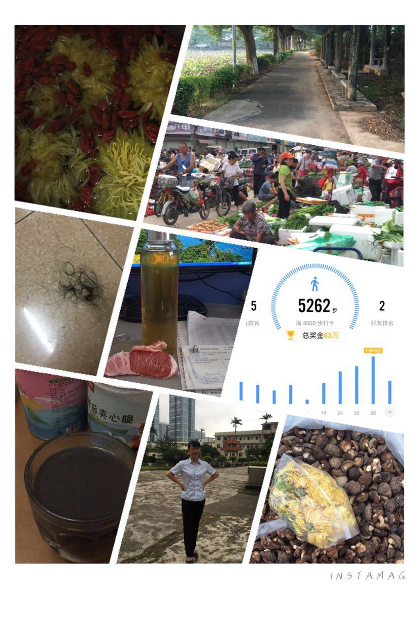 早起散散步,呼吸新空气。逛个早市,买点菊花,煲个菊花枸杞茶。还有时间,做杯芝麻糊暖暖肚。呵呵🤭忙完洗个靓凉精神气爽出门。噢,还有,那点头发,洗一次头就掉这些,不算多吧。5000多步,没压力!