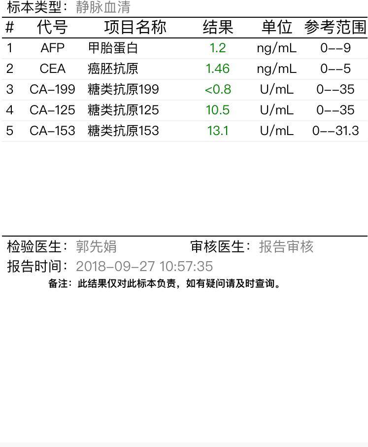听从一位姐妹的建议,昨天还是去医院查了血全套、胸片和B超,除了化疗引起的肝损伤,谷丙转氨酶有点高(65)之外,其它一切正常。心也放下来了!