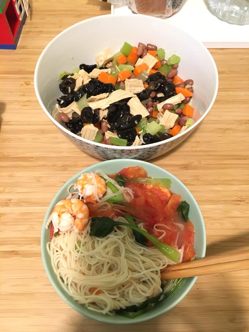 今天尝试了拌个凉菜,下个面条,一边看电视一边吃,也挺惬意。