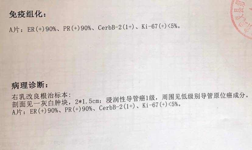 我妈妈47岁,乳腺癌,已做右乳房切除手术,腋下淋巴也都切除了,一共17颗,其中一颗转移。免疫组化结果如图所示,希望大家可以帮我看看,分析一下,非常感谢!