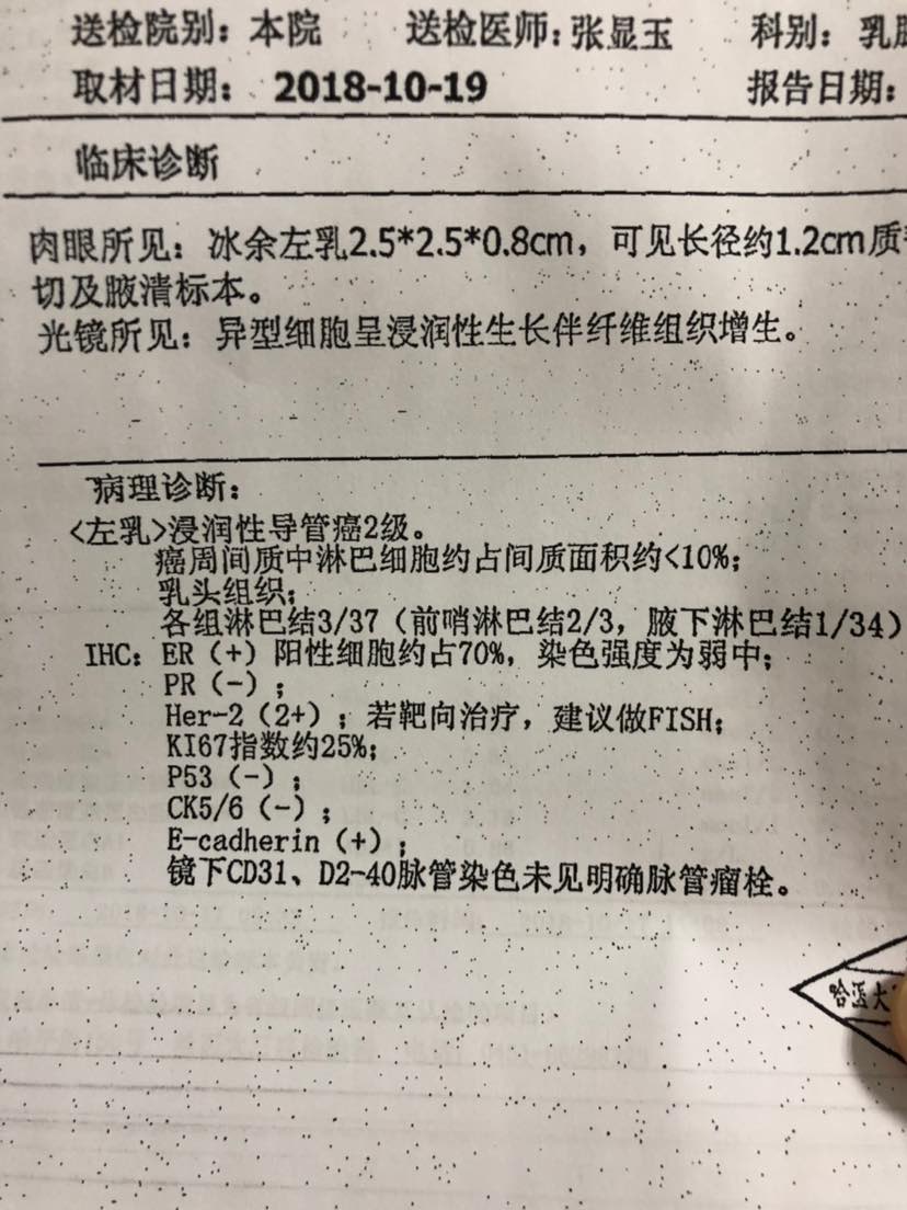绿柳青青ER阳PR阴,要做fish,看要不要靶向治疗,KI67指数不高。