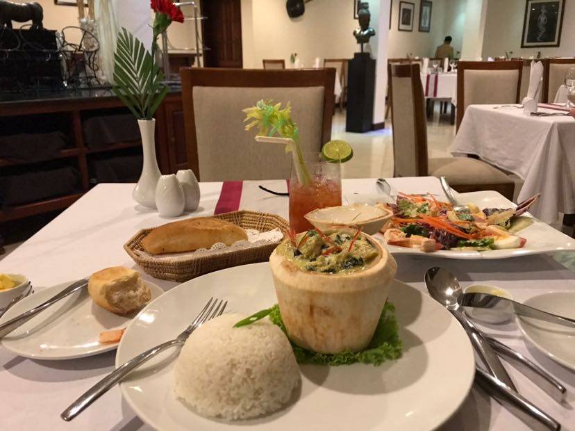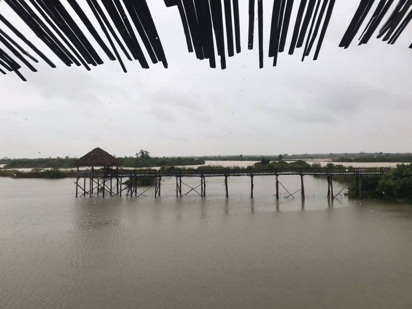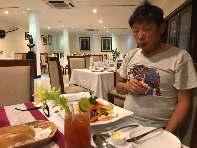 从金边到这里300多公里,大巴开了6个小时。当然这6个小时包括了中间吃饭上厕所的时间。只间午饭时间,老公坚持不吃,他建议我也不吃,但我饿,还是吃了🤭🤭🤭。他不吃,去欣赏风景去了。